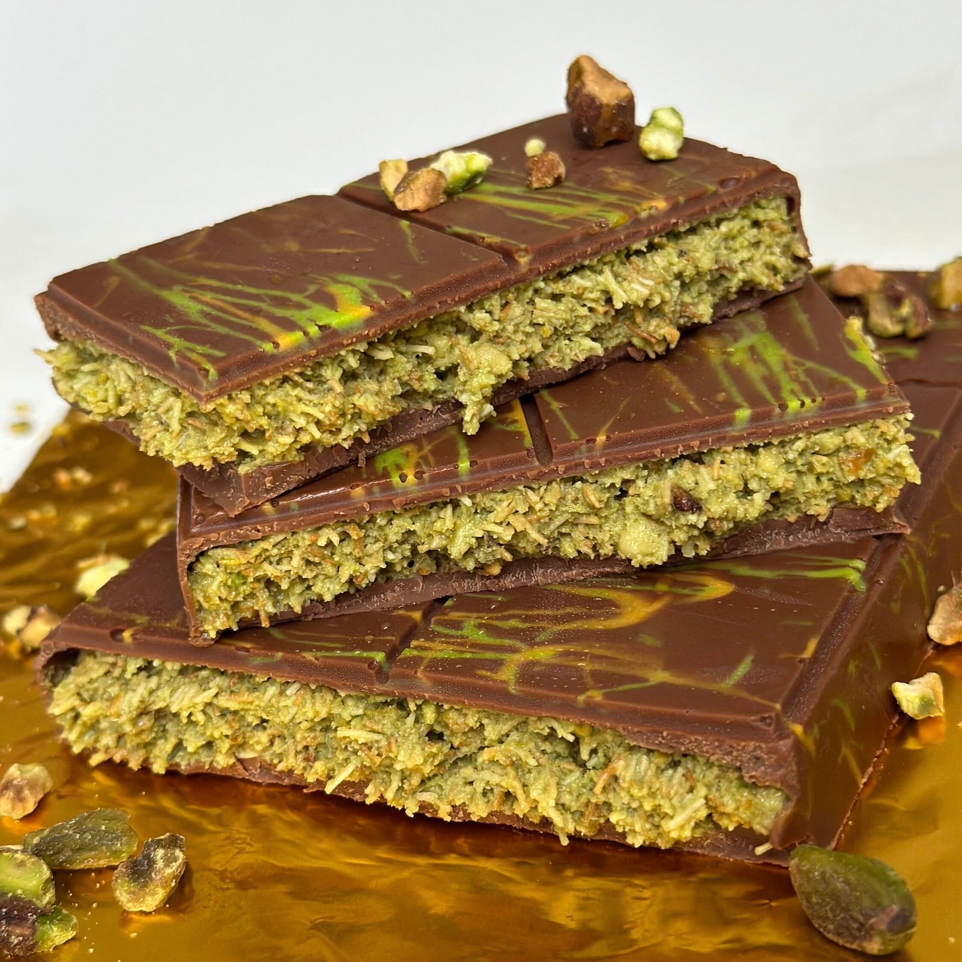 16 oz. Crispy Knafeh mixed with Pistachio and Tahini paste, encased in milk, dark or white chocolate.